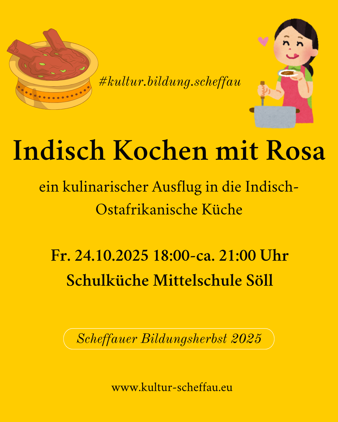 Lass dich entführen in die Welt exotischer Düfte und Geschmäcker. Wir kochen in der Schulküche der Mittelschule Söll gemeinsam köstliche Kokoshühnchen mit Basmatireis und frischen Salat, dazu eine vegetarische Curry-Variante. Lerne neue, kulinarische Horizonte kennen und begeistere Familie oder die Gäste deiner nächsten Hausparty, wenn du dieses Gericht nachkochst.